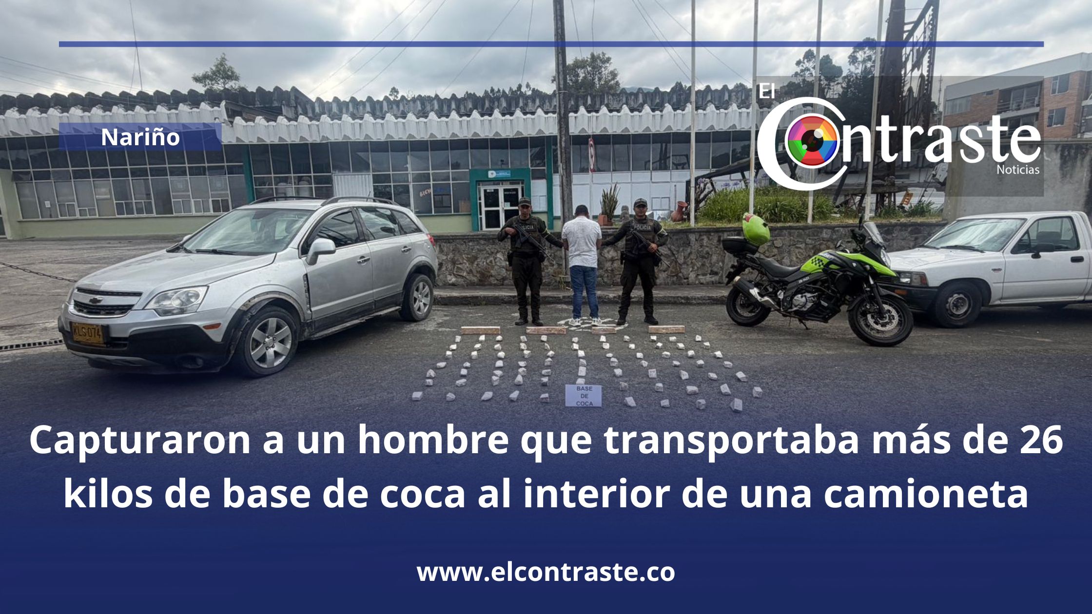 En la vía que conecta a Pasto con Sibundoy, la Policía Nacional capturó a un hombre que al parecer transportaba más de 26 kilos de base de coca al interior de una camioneta. El ciudadano fue detenido por el delito de tráfico de estupefacientes y ahora espera la decisión de un juez de la república que definirá su situación penal luego de este hecho.