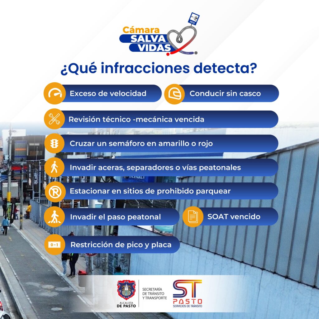 Entre las infracciones que podrá detectar esta cámara se encuentran el exceso de velocidad, la falta de SOAT y revisión tecnomecánica vigentes, el paso de semáforo en rojo, maniobras peligrosas, invasión de aceras y pasos peatonales, así como el parqueo en sitios prohibidos.