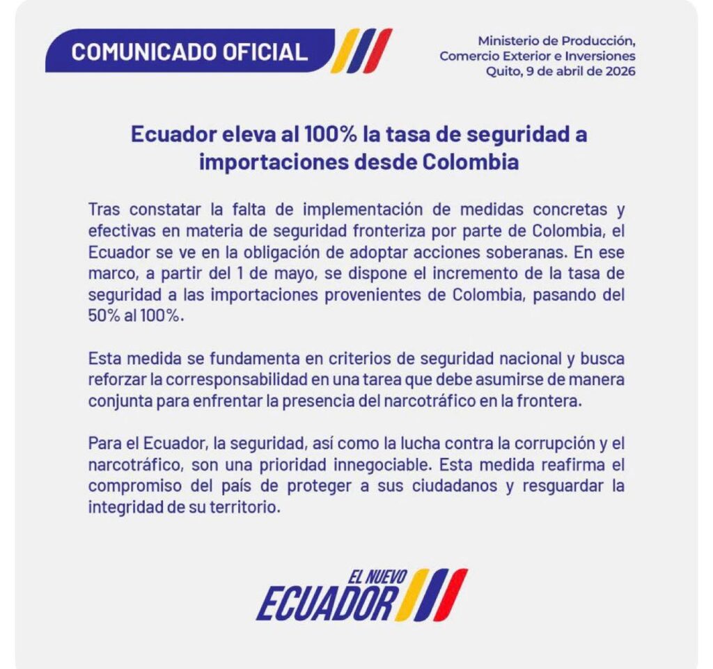 Es importante recordar que Colombia respondió hace semanas atrás a estas medidas desde Ecuador con aranceles de hasta el 50% a productos del vecino país. Ahora con la imposición de nuevos tributos desde Ecuador, se espera que Colombia reafirme sus medidas en medio de las tensiones diplomáticas con el gobierno de Daniel Noboa.