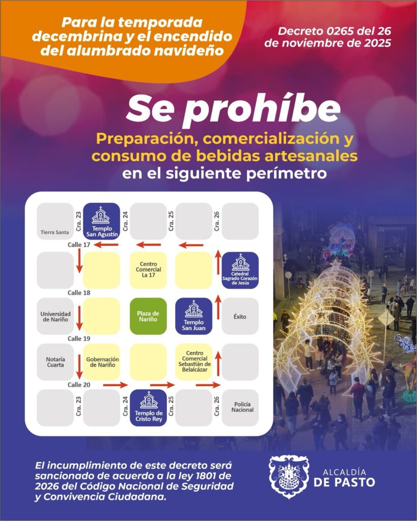 La Alcaldía de Pasto emitió el decreto 0265 del 26 de noviembre de 2025, que prohíbe la preparación, comercialización y consumo de bebidas embriagantes de tipo artesanal en un sector del centro de la ciudad. La restricción aplica entre las carreras 23 y 26, y las calles 17, 18, 19 y 20, zonas incluidas dentro del corredor del alumbrado navideño.