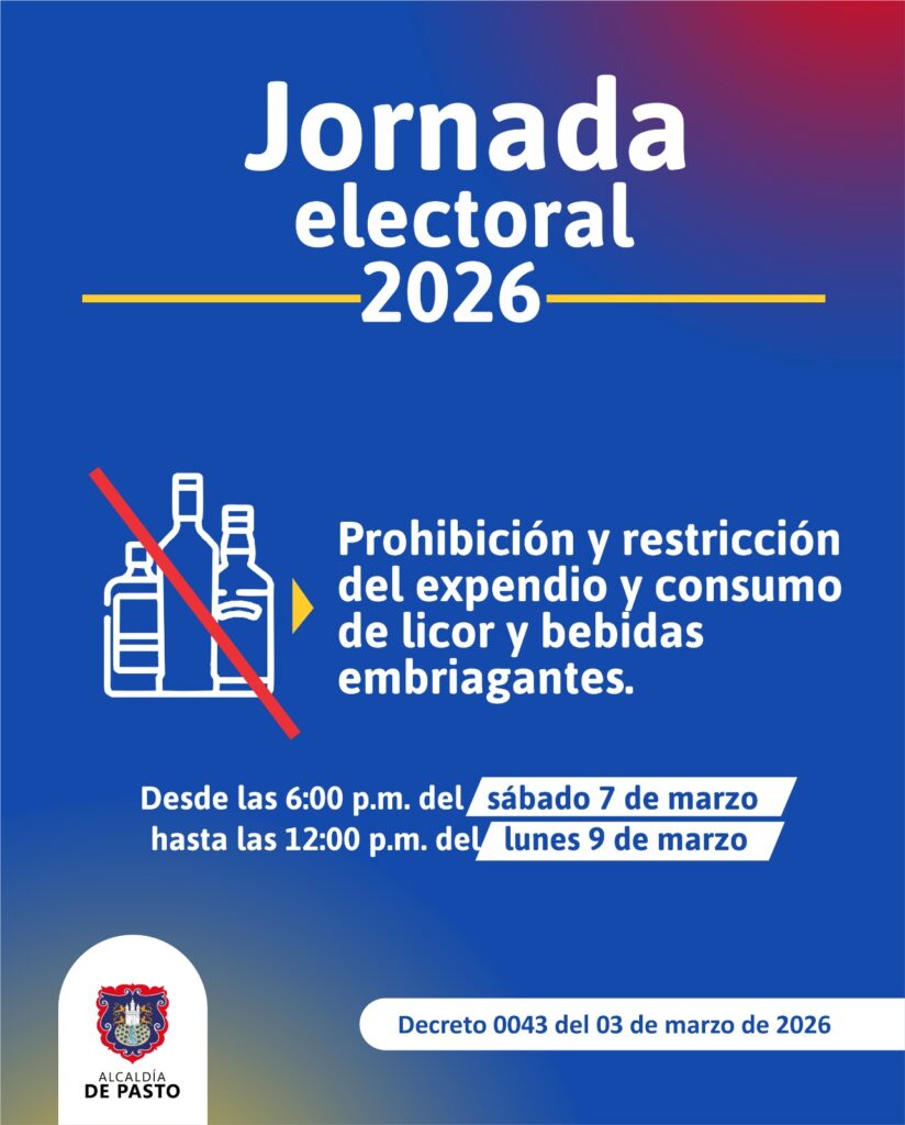 La Alcaldía de Pasto, a través del decreto 0043 del 3 de marzo de 2026, estableció medidas de orden público para garantizar la seguridad en las elecciones a Congreso del próximo 8 de marzo de 2026. Entre las medias a destacar se encuentra la ley seca que iniciará después de las 6:00 pm del sábado 7 de marzo hasta las 12:00 del medio del lunes 9. Estas medidas aplican en la zona urbana y rural de la capital del departamento de Nariño.