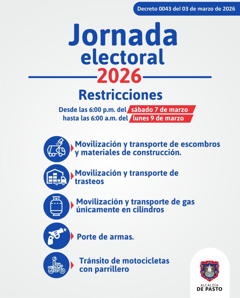Así mismo, se prohibió el porte de armas en el municipio, el trasteo y transporte de escombros, el parrillero hombre y la movilización de cilindros de gas con el fin de evitar alteraciones al orden público. Las autoridades indicaron que reforzarán la seguridad y el cumplimiento de este decreto en todos los barrios, comunas y corregimientos de Pasto con el objetivo de garantizar la normalidad en los comicios de Congreso de la República.