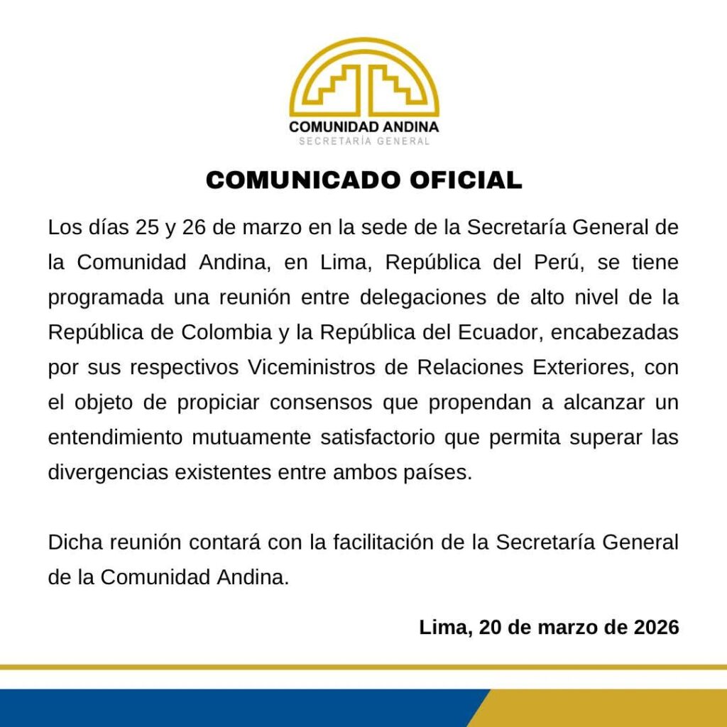 Luego de varias semanas de tensión diplomática entre Colombia y Ecuador, se conoció que en la cuarta semana de marzo habría una reunión entre los presidentes Gustavo Petro y Daniel Noboa en Lima, Perú. Esta reunión podría significar un avance para desescalar las tensiones entre las dos naciones que hoy discuten temas arancelarios y de soberanía.