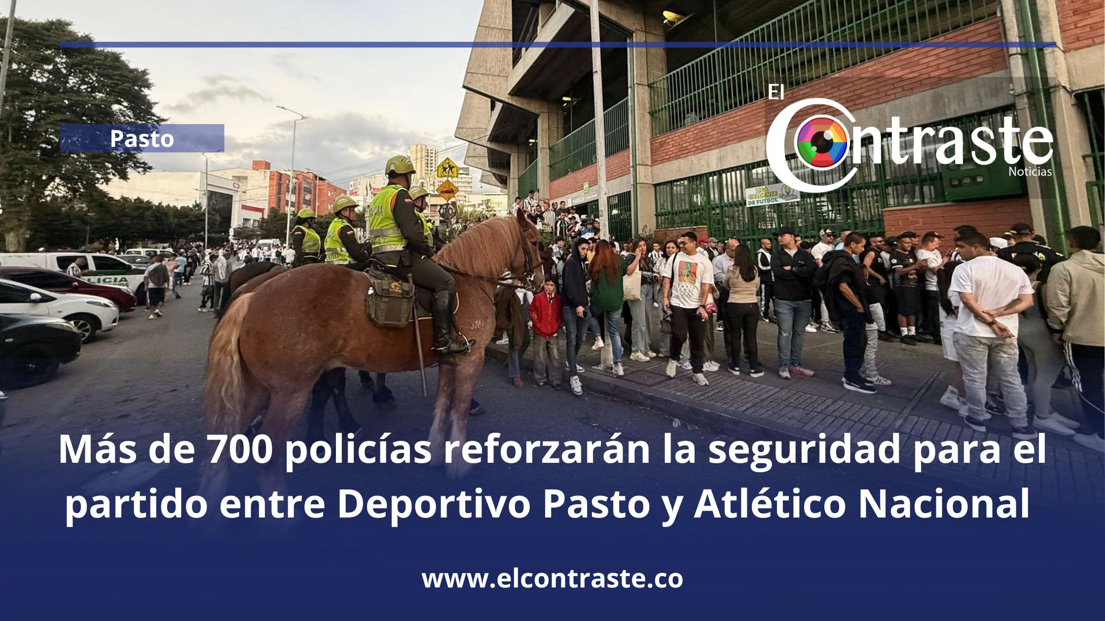 De cara al partido entre Deportivo Pasto y Atlético Nacional que se disputará el próximo domingo a las 6:30 pm en el estadio Libertad, la Policía Nacional informó que más de 700 uniformados garantizarán la seguridad y el orden público en este escenario deportivo ante la llegada masiva de hinchas visitantes a este compromiso deportivo la Liga BetPlay. Así mismo, se habilitará el ingreso de mayores de 14 años de edad en la tribuna norte que estará disponible para el equipo visitante.